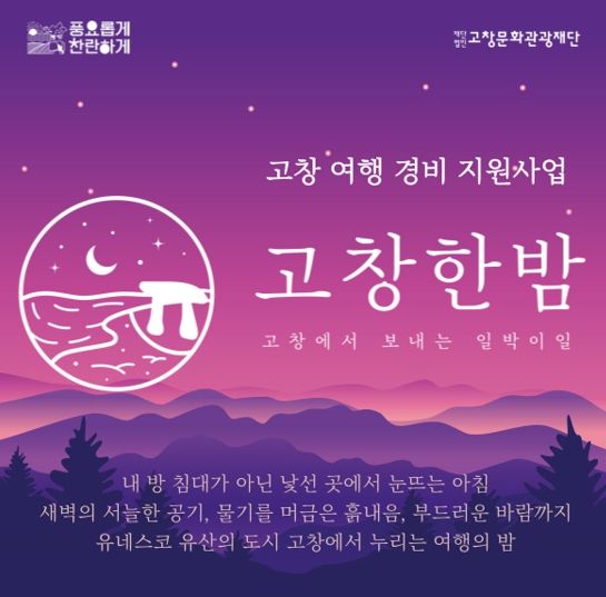 ‘고창한밤’은 국내 소도시 여행 수요 증가에 발맞춰 관광지로서 고창의 매력을 알리기 위해 여행경비를 지원하는 사업이다.