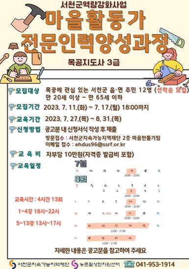 [제주교통복지신문 김강석 기자] (재)서천군지속가능지역재단이 오는 21일까지 ‘마을 맞춤형 전문인력양성과정’에 참여를 희망하는 현장활동가를 모집한다.