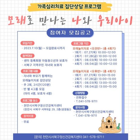[제주교통복지신문 김강석 기자] 천안시 서북구정신건강복지센터가 여름방학을 맞아 부모와 자녀가 함께하는 집단모래놀이치료 프로그램을 운영한다고 17일 밝혔다.