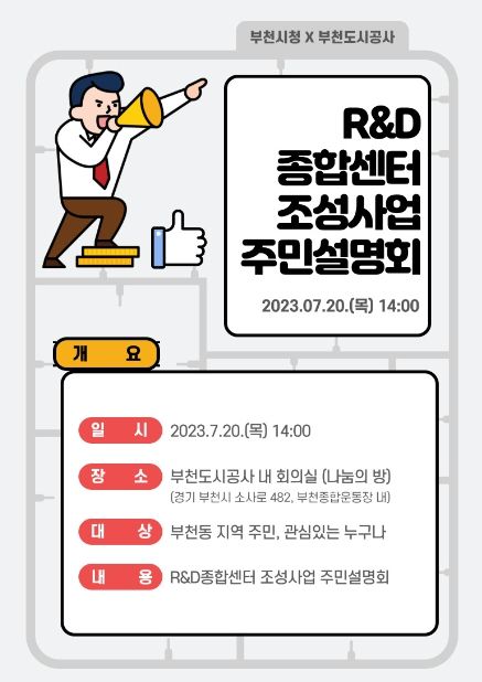 [제주교통복지신문 김강석 기자] 부천시는 오는 7월 20일 오후 2시 부천도시공사 1층 나눔의방에서 ‘춘의 경제기반형 부천 허브렉스’의 일환으로 추진하는 ‘R&D종합센터 조성사업’ 주민설명회를 개최한다.