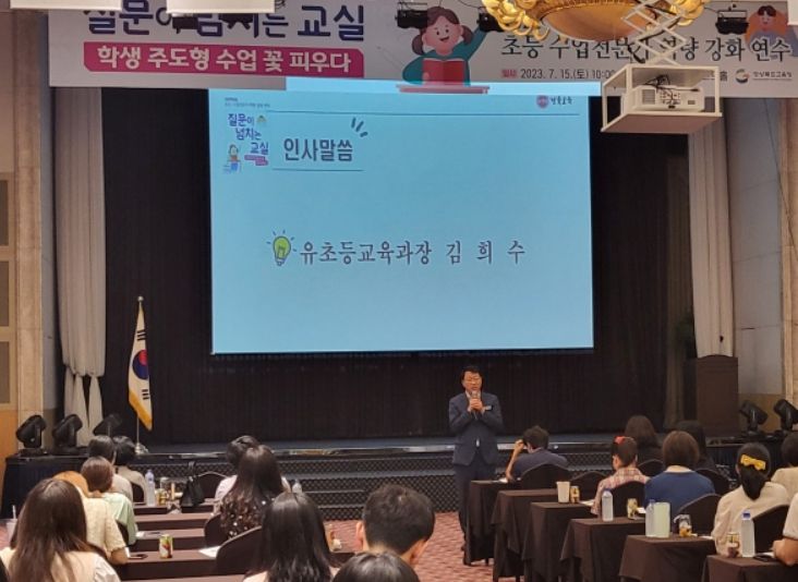 이번 연수는‘질문이 넘치는 교실 학생 주도형 수업 꽃 피우다’라는 주제로 미래 학교 교육 환경 변화에 대응하는 수업 전문성 신장을 위해 마련했다.