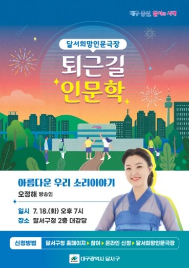 [제주교통복지신문 김강석 기자] 대구 달서구는 오는 7월 18일과 9월 12일 오후 7시 구청 2층 대강당에서 2023 달서희망인문극장 '퇴근길 인문학'을 운영한다고 밝혔다.