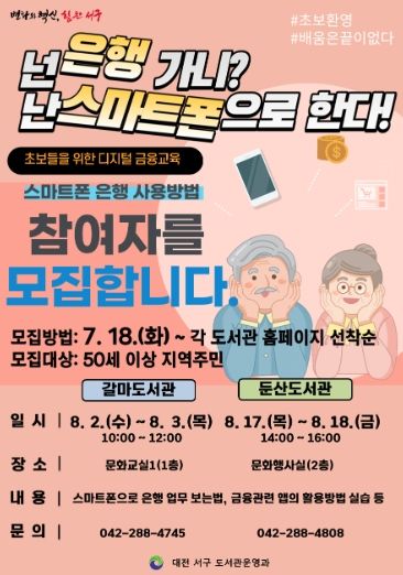 [제주교통복지신문 김강석 기자] 대전 서구 갈마·둔산도서관은 정보 취약계층을 위해 ‘시니어 디지털 금융교육’ 프로그램을 운영한다.