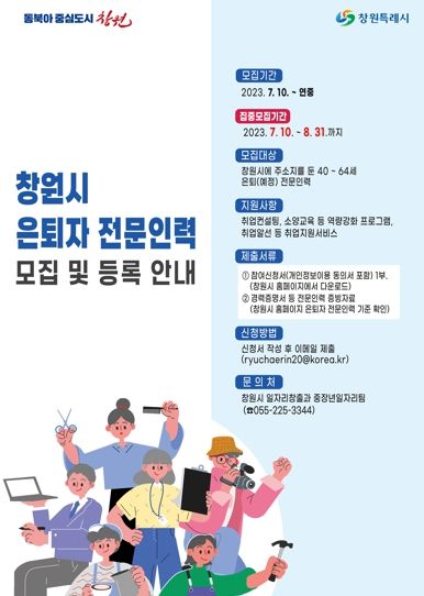 [제주교통복지신문 김강석 기자] 창원특례시는 지난 7월 10일부터 전문지식과 경험을 갖춘 40세 이상 64세 미만 중장년 은퇴자를 대상으로 재무, 인사, 생산관리 등 다양한 분야의 은퇴자 전문인력을 연중 모집하여 ‘전문인력풀’을 구성한다고 17일 밝혔다.