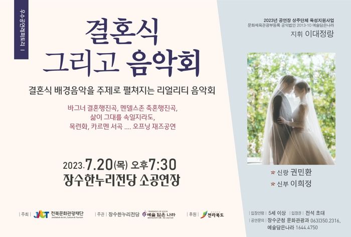 [제주교통복지신문 김강석 기자] 장수군은 오는 20일 오후 7시 30분에 장수한누리전당 소공연장에서 전라북도 문화관광재단 공모사업으로 추진하는 ‘결혼식 그리고 음악회’ 공연을 개최한다.