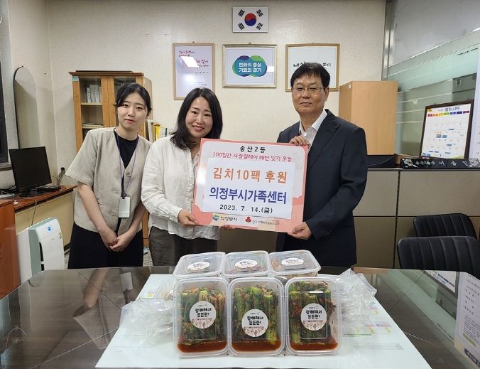 [제주교통복지신문 김강석 기자] 의정부시 송산2동주민센터는 의정부시 가족센터가 7월 14일 영양 결핍이 우려되는 취약계층을 위해 오이김치 10팩을 직접 만들어 전달했다고 밝혔다.