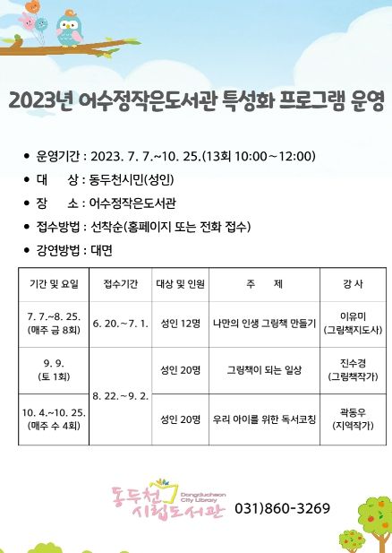[제주교통복지신문 김강석 기자] 동두천시 시립도서관은 지난 7일부터 오는 10월까지 어수정 작은도서관에서 ‘나만의 인생 그림책 만들기, 그림책이 되는 일상, 우리 아이를 위한 독서 코칭’ 등 3개 강좌를 특성화 프로그램으로 운영한다.