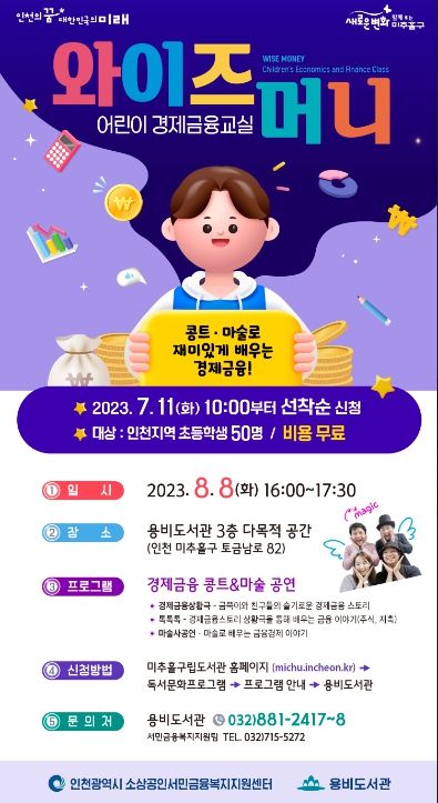 [제주교통복지신문 김강석 기자] 인천시 미추홀구 용비도서관은 오는 8월 8일 도서관 다목적 공간에서 ‘와이즈머니어린이 경제금융교실’을 연다.