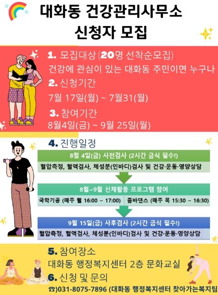 [제주교통복지신문 김강석 기자] 고양특례시 대화동 행정복지센터는 주민들의 건강관리를 위해‘대화동 건강관리사무소’의 신청자를 7월 17일부터 31일까지 선착순 20명 모집한다고 밝혔다.