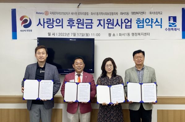 [제주교통복지신문 김강석 기자] 수원시 팔달구 화서1동, 새수원로타리클럽, 화서초등학교, 화서1동 지역사회보장협의체는 지난 17일 화서1동 행정복지센터에서 ‘사랑의 후원금 지원사업’ MOU 협약식을 개최했다.