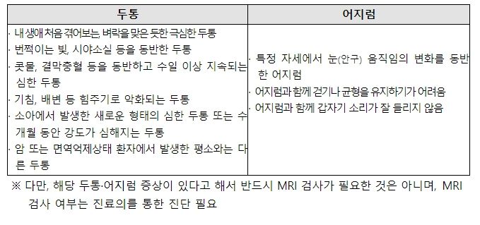 뇌질환과 무관한 두통·어지럼에 MRI 검사가 남용되는 것을 방지하기 위하여 뇌질환이 의심되는 두통·어지럼에 대한 급여기준을 구체화했다.
