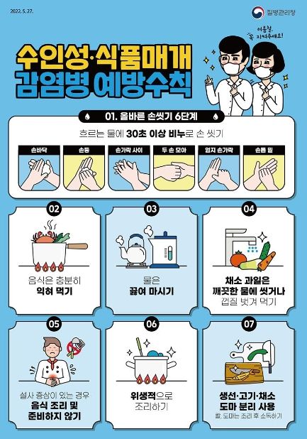 수인성‧식품매개감염병 예방을 위해 조리 전· 후와 식사 전에는 비누로 30초 이상 손을 씻도록 하고, 안전한 물(포장된 생수나 끓인 물)과 익힌 음식물을 섭취하도록 한다. 설사, 구토 등의 증상이나 손에 상처가 있는 경우 식재료 세척 등 조리과정에 참여하지 않도록 하며, 물이 닿거나 일정시간(약 4시간) 이상 냉장이 유지되지 않은 음식은 섭취하지 않도록 한다.