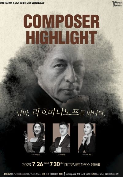 한국을 대표하는 클래식 전용 공연장인 대구콘서트하우스는 재개관 10주년을 맞이하여 2023년을 기념 해로 맞이하는 작곡가들을 주목해보는 ‘Composer Highlight’ 프로그램을 준비했다. 2023년이 탄생 150주년이자, 서거 80주년인 라흐마니노프가 이 프로그램의 문을 연다. 일반 시민들이 클래식 장르에 쉽게 접할 수 있도록 노력하고 있는 바이올리니스트 오은정, 첼리스트 이동열, 피아니스트 이다영이 라흐마니노프의 숨겨진 명곡을 연주할 예정이다.