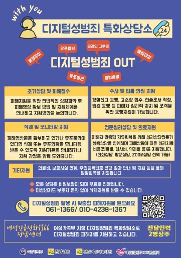 디지털 성범죄 특화상담소는 24시간 전문 상담, 피해 영상물 삭제 지원, 수사기관·법원 동행, 법률·의료서비스 연계 등 1대1 맞춤형 지원과 치유회복 프로그램을 제공한다.