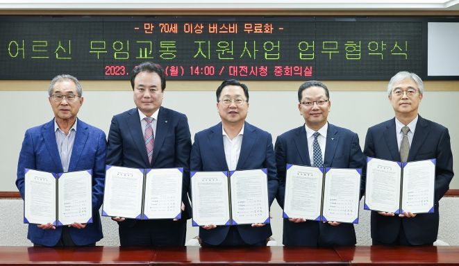 [제주교통복지신문 김강석 기자] 대전시는 17일 하나은행, 하나카드, 버스운송사업조합, 티머니와 ‘만 70세 이상 어르신 무임교통 지원사업을 위한 업무협약’을 체결했다.