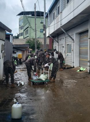 17일에는 청주대대 37사단 군인 50명, 운천신봉동 주민자치위, 통장협의회 등 직능단체 회원 20여 명, 적십자사 10여 명 등이 침수 이후 쌓인 토사와 침수주택을 청소하며 빠르게 피해 복구를 도왔다.