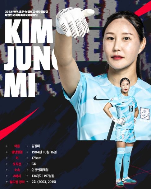 20년에 걸친 대표팀 생활 끝에 세 번째 월드컵을 준비한다. 2003 미국 월드컵에서 막내 골키퍼로 태극마크를 달았던 김정미는 20년이 지난 2023년에도 변함없이 대표팀의 골문을 지키고 있다.