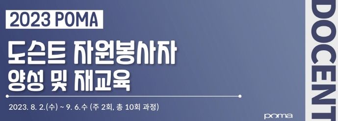 [제주교통복지신문 김강석 기자] 포항시립미술관은 오는 19일부터 30일까지 도슨트(전시해설사)활동을 희망하는 성인을 대상으로 ‘POMA 도슨트 양성교육’ 수강생을 모집한다.