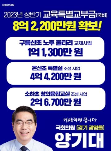 [제주교통복지신문 김강석 기자] 더불어민주당 양기대 국회의원(경기광명을)이 2023년도 상반기 국비인 교육특별교부금으로 초등학교 3개 사업, 총 8억 2,200만 원을 확보했다고 17일 밝혔다.