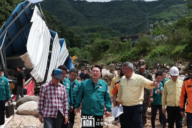 [제주교통복지신문 김강석 기자] 윤석열 대통령은 7월 17일 집중호우로 피해를 입은 경북 예천군 산사태 피해 현장을 찾아 현장 상황을 점검하고 이재민들을 위로했다.