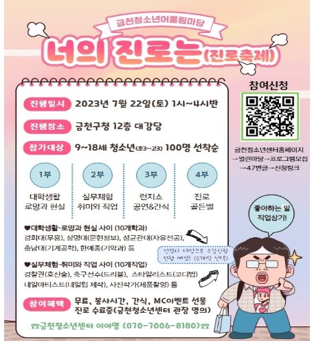 [제주교통복지신문 김강석 기자] 금천구는 7월 22일 오후 1시 금천구청 12층 대강당에서 금천청소년어울림마당 진로 축제 ‘너의 진로는’을 개최한다.