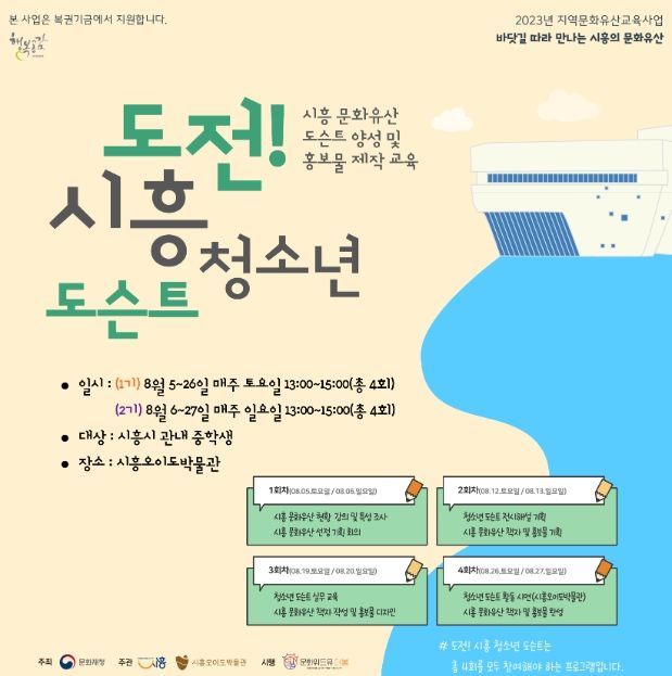 이번 도슨트 진로체험 프로그램은 2023년 문화재청 지역문화유산교육사업의 하나로 진행된다. 청소년들이 박물관의 전시 해설을 통해 시흥의 문화유산을 살펴보고, 홍보물 제작을 체험할 수 있게 하고자 마련됐다.