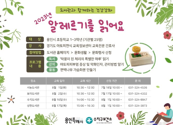 [제주교통복지신문 김강석 기자] 용인특례시 수지구보건소가 방학을 맞아 도서관을 이용하는 초등학교 1~3학년을 대상으로 ‘알레르기 질환’ 예방 교육을 운영, 참가자를 모집한다고 18일 밝혔다.