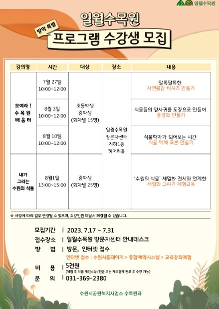 [제주교통복지신문 김강석 기자] 수원수목원(일월‧영흥)이 여름방학을 맞아 운영하는 특별 프로그램 ‘모여라! 수목원 배움터’·‘내가 그리는 수원의 식물’에 참가할 초‧중학생을 선착순으로 모집한다.