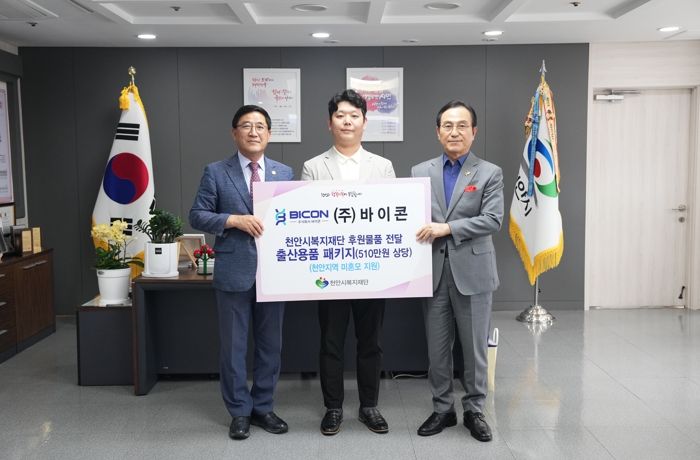 [제주교통복지신문 김강석 기자] ㈜바이콘이 지난 17일 천안지역 미혼모를 위해 출산용품 패키지(500만 원 상당)를 천안시복지재단에 전달했다.