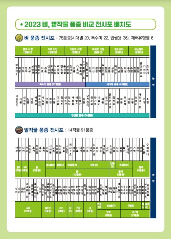 전시 재배지는 무복토 이앙과 무논 점뿌림(무논점파) 같은 재배유형별로 6곳이 조성돼 있다. 품종별로는 신품종(특수미 3, 밥쌀용 6) 9종을 비롯해 시대별 대표 품종 20종, 특수미 22종, 밥쌀용 36종 등 모두 87품종이 전시되어 있다.