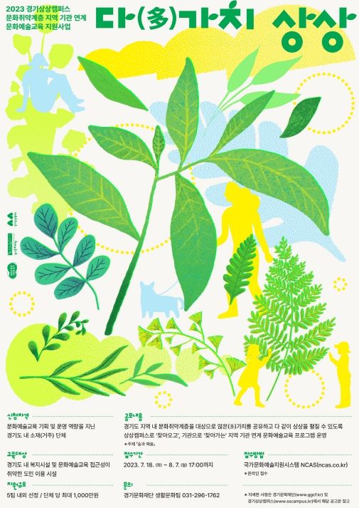 [제주교통복지신문 김강석 기자] 경기문화재단(대표이사 유인택) 경기상상캠퍼스는 문화취약계층 지역 기관연계 문화예술교육 지원사업 '다(多)가치 상상'의 공모 접수를 7월 18일부터 8월 7일 17시까지 진행한다고 밝혔다.