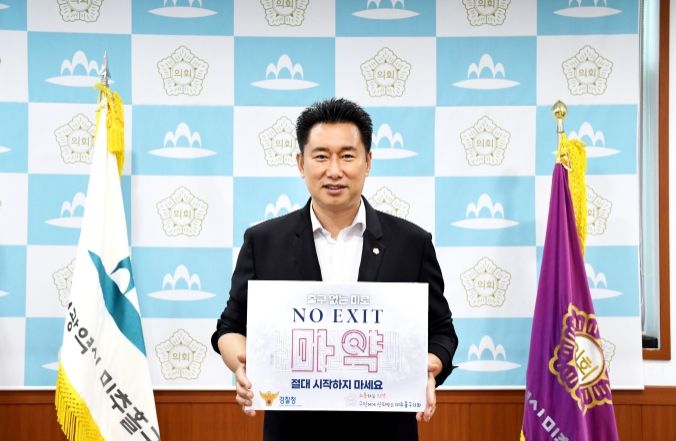 [제주교통복지신문 김강석 기자] 김재원 인천시 미추홀구의회 의원이 18일 마약범죄 예방 ‘노 엑시트(NO EXIT)’릴레이 캠페인에 동참했다.