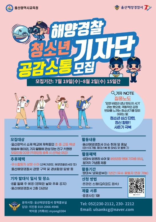 [제주교통복지신문 김강석 기자] 울산해양경찰서(서장 정욱한)는 청소년의 역량 개발 및 진로 설계에 도움을 주고, 청소년의 눈으로 국민과 소통하기 위해 ‘울산해양경찰 청소년 공감소통 기자단’을 7월 19일부터 8월 2일까지 모집한다고 밝혔다.