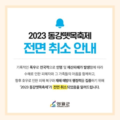 최명서 영월군수는 “오송 지하차도 침수 등 수해로 인한 피해자와 유가족들의 아픔을 함께하고자 축제를 취소했으며, 피해 복구와 예방에 집중하겠다”고 전했다.