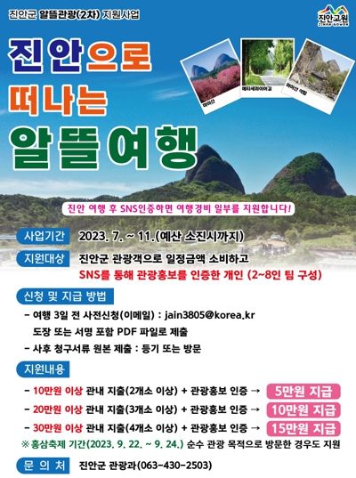 진안군은 관광홍보와 관내 관광사업체 매출증대를 위해 ‘진안군 알뜰관광 지원사업(2차)’을 실시한다.