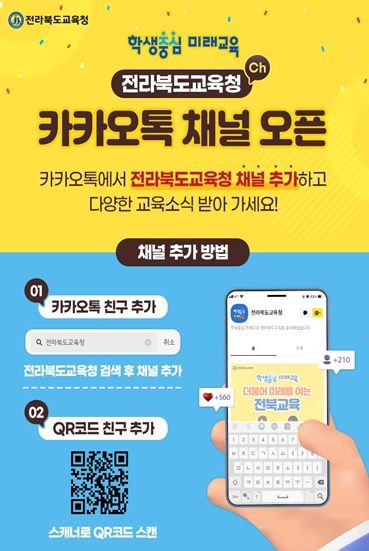 한성하 대변인은 “전북교육청 카카오톡 채널 개설을 통해 전북교육 소식을 보다 효과적으로 공유하고, 교육정책에 대한 학교 현장과 도민들의 관심을 높이고자 한다”면서 “기존 운영하는 블로그, 유튜브 등 SNS 채널과 연계해 전북교육소식을 적극 홍보하겠다”고 말했다.