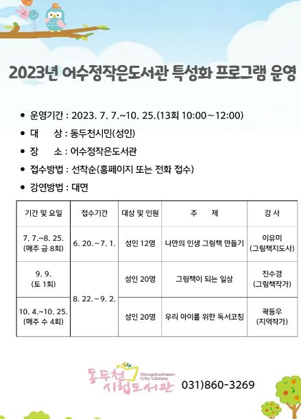 [제주교통복지신문 김강석 기자] 동두천시 시립도서관은 지난 7일부터 오는 10월까지 어수정 작은도서관에서 ‘나만의 인생 그림책 만들기, 그림책이 되는 일상, 우리 아이를 위한 독서 코칭’ 등 3개 강좌를 특성화 프로그램으로 운영한다.