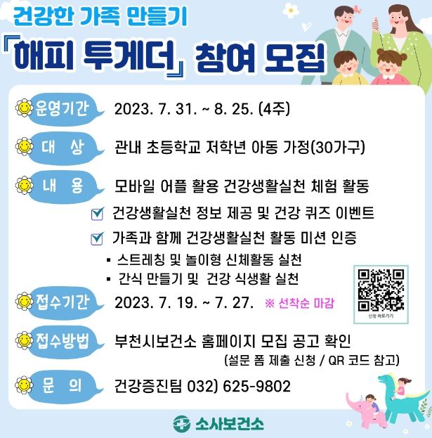 [제주교통복지신문 김강석 기자] 부천시는 여름 방학을 맞아 성장기 아동의 건강생활 습관 정착을 위해 오는 7월 31일부터 8월 25일까지 체험형 건강증진 프로그램 ‘해피 투게더’를 운영한다.