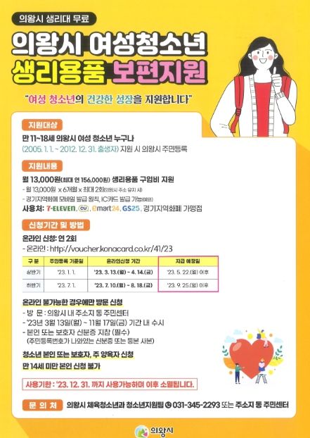 지원대상은 7월 1일 기준 의왕시에 주민등록이 되어 있는 11~18세(2005년1월1일~2012년12월31일 출생자) 여성청소년으로, 여성가족부에서 생리용품 바우처 지원을 받고 있는 대상자는 제외된다.