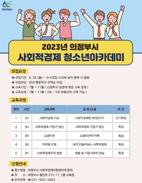[제주교통복지신문 김강석 기자] 의정부시 사회적경제지원센터는 7월부터 11월까지 청소년들의 사회적경제 인식 개선을 위한 중학생 대상 ‘2023년 사회적경제 청소년 아카데미’를 운영한다.
