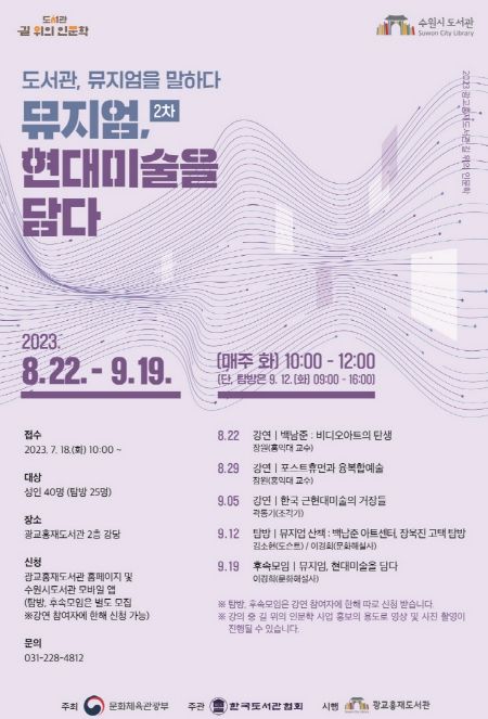 [제주교통복지신문 김강석 기자] 수원시 광교홍재도서관이 2023년 길 위의 인문학 ‘도서관, 뮤지엄을 말하다 : 2차 뮤지엄, 현대미술을 담다’ 수강생 40명을 18일 오전 10시부터 선착순으로 모집한다.