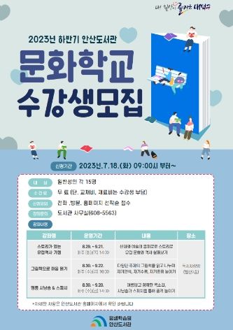 하반기 문화학교는 안산도서관 홈페이지 또는 전화, 방문 접수가 가능하며, 강좌에 대한 궁금한 사항은 도서관 소식지, 도서관 SNS, 밴드(BOOKing~) 등을 참고하면 된다. 자세한 사항은 안산도서관에 문의하면 자세한 안내를 받을 수 있다.