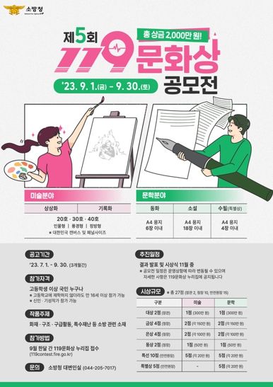 공모전 참가 자격은 만 16세 이상 국민이면 누구나 가능하며 참가 신청은 9월 한 달 동안 119문화상 누리집에서 온라인으로 접수하면 된다.