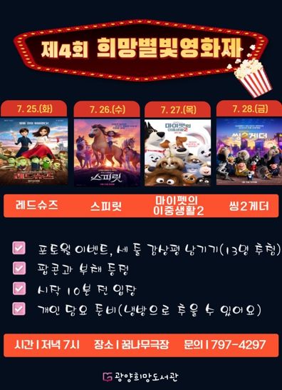 [제주교통복지신문 김강석 기자] 광양희망도서관은 오는 25일부터 28일까지 도서관 3층 꿈나무극장에서 '제4회 희망별빛영화제'를 운영한다고 밝혔다.