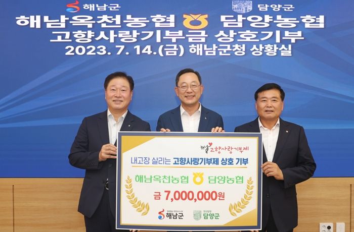 [제주교통복지신문 김강석 기자] 해남옥천농협과 담양농협은 고향사랑기부제의 성공적인 정착과 지역 간 상생발전을 위해 각 조합 임직원 70명의 뜻을 모아 마련한 기부금 700만원씩을 상호 기부했다.