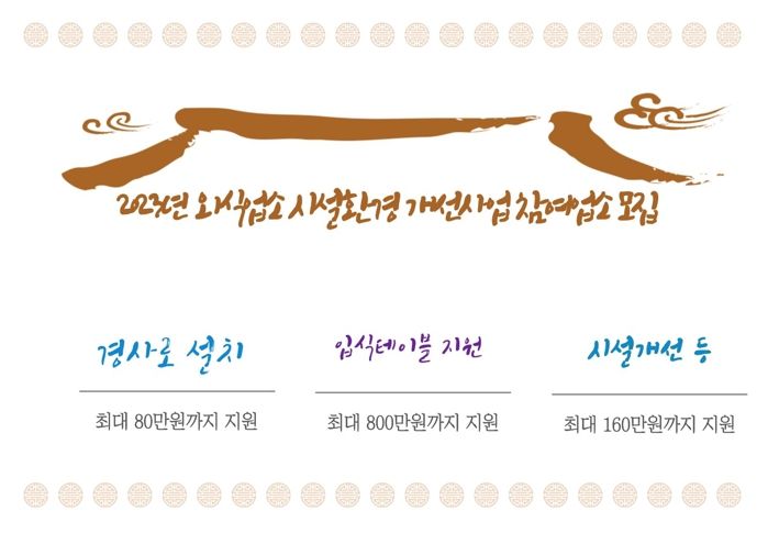 시는 ▲노인과 장애인 등의 이용 편의를 위한 진입 경사로 설치(최대 80만원) ▲좌식 식탁을 입식 식탁으로 교체(최대 800만원) ▲화장실과 주방 바닥 등 노후 시설의 개선(최대 160만원)을 희망하는 외식 업소를 지원할 계획이다.