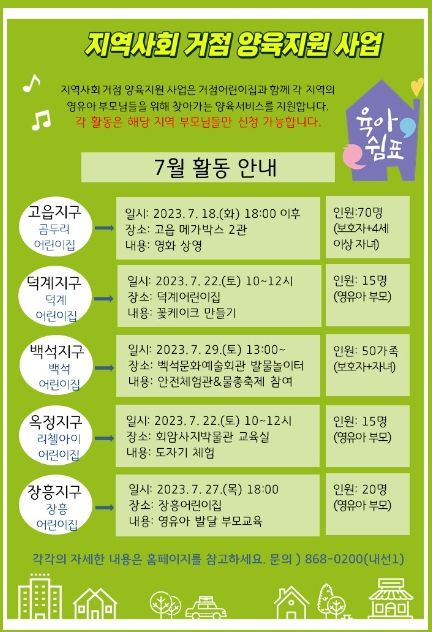 센터는 양육정보 접근성이 먼 곳을 중심으로 5개 지역(백석읍, 장흥면, 덕계동, 고읍동, 옥정동)에 공립어린이집 5개 소를 ‘거점 어린이집’으로 선정해 ‘부모교육’ 중점 제공기관으로 육성한다.
