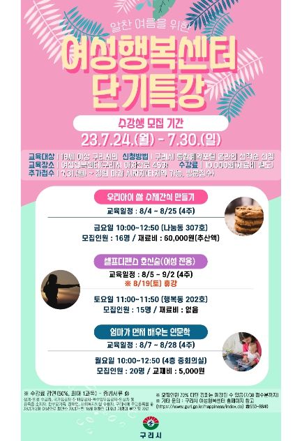 [제주교통복지신문 김강석 기자] 구리시는 오는 7월 24일부터 7월 30일까지 ‘여성행복센터 단기특강’ 수강생을 모집한다.