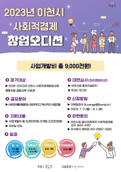 [제주교통복지신문 김강석 기자] 이천시는 올해 처음으로 2023 이천시 사회적경제 창업오디션 참가자를 7월17일부터 8월1일 15시까지 모집한다.