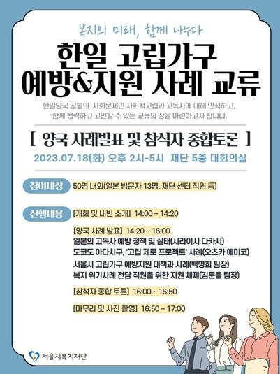 7월 18일 오후 2시에는 일본 관제워킹푸어연구회(NPO) 대표 및 도쿄, 치바현 시의원 13명, 재단 및 센터 직원들이 참석한 가운데 총 3시간에 걸친 한일 고립가구 예방 지원 정책발표와 사례공유 및 참석자 종합토론이 진행된다.